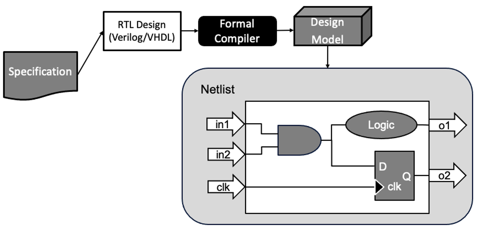 Formal verification involves translating RTL into a netlist representing an electric circuit composed of digital gates like AND, OR, flip-flops, and latches. These gates are modeled to match their real-world counterparts' behavior but are optimized for formal verification.